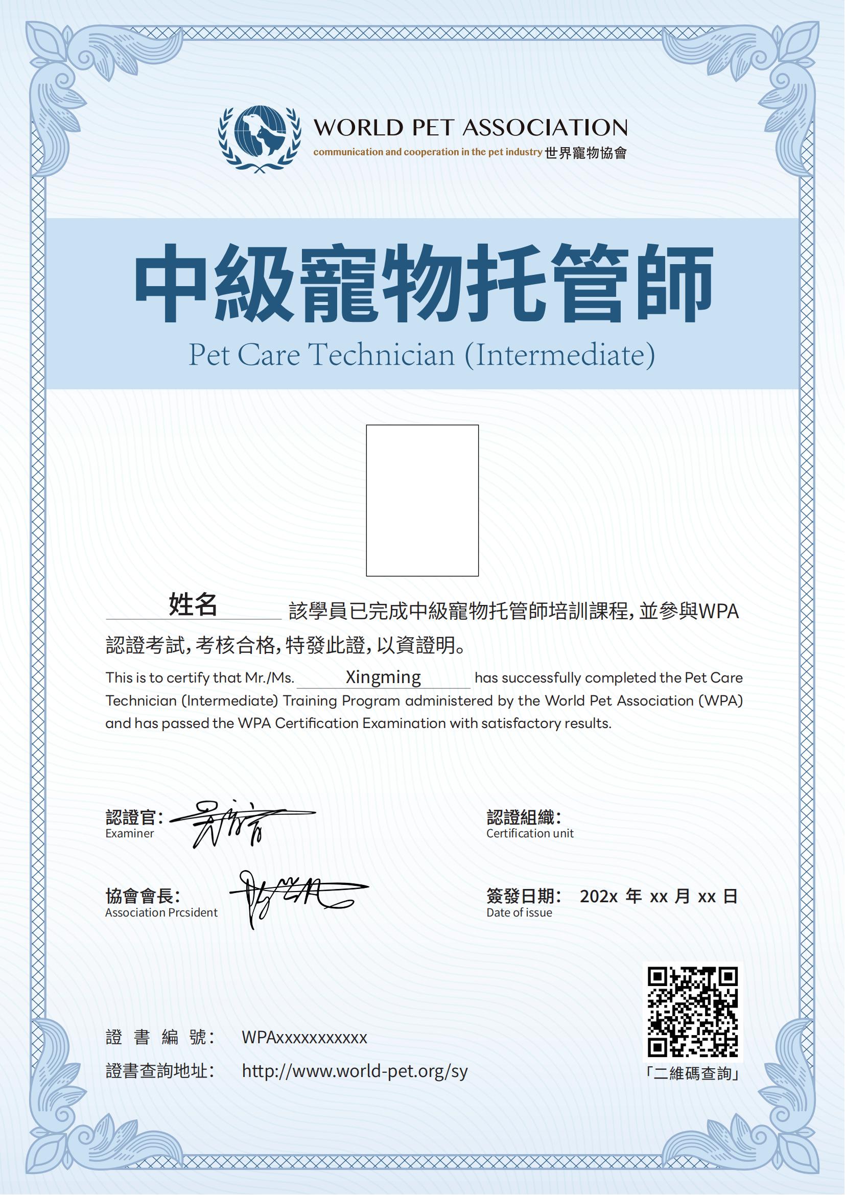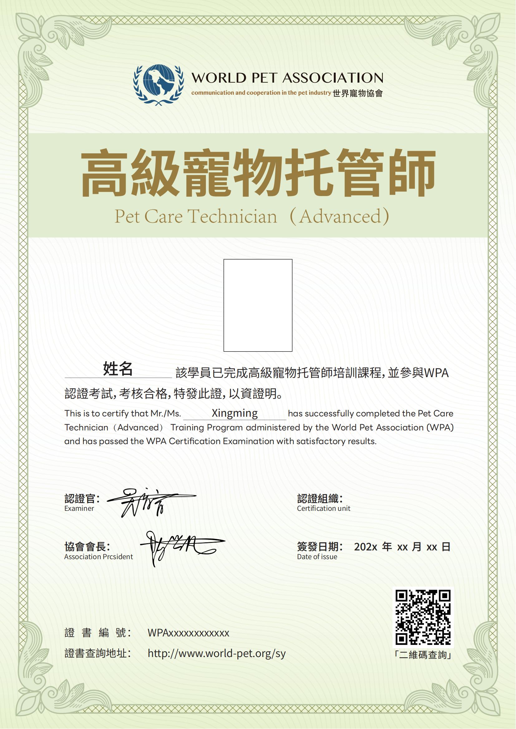 宠物托管师证书仅限 WPA 世界宠物协会授权的宠业人才技能培训授权服务机构颁发,学员需要完成相应课程学习培训,统一参与WPA考核,考核通过方可领取证书。
