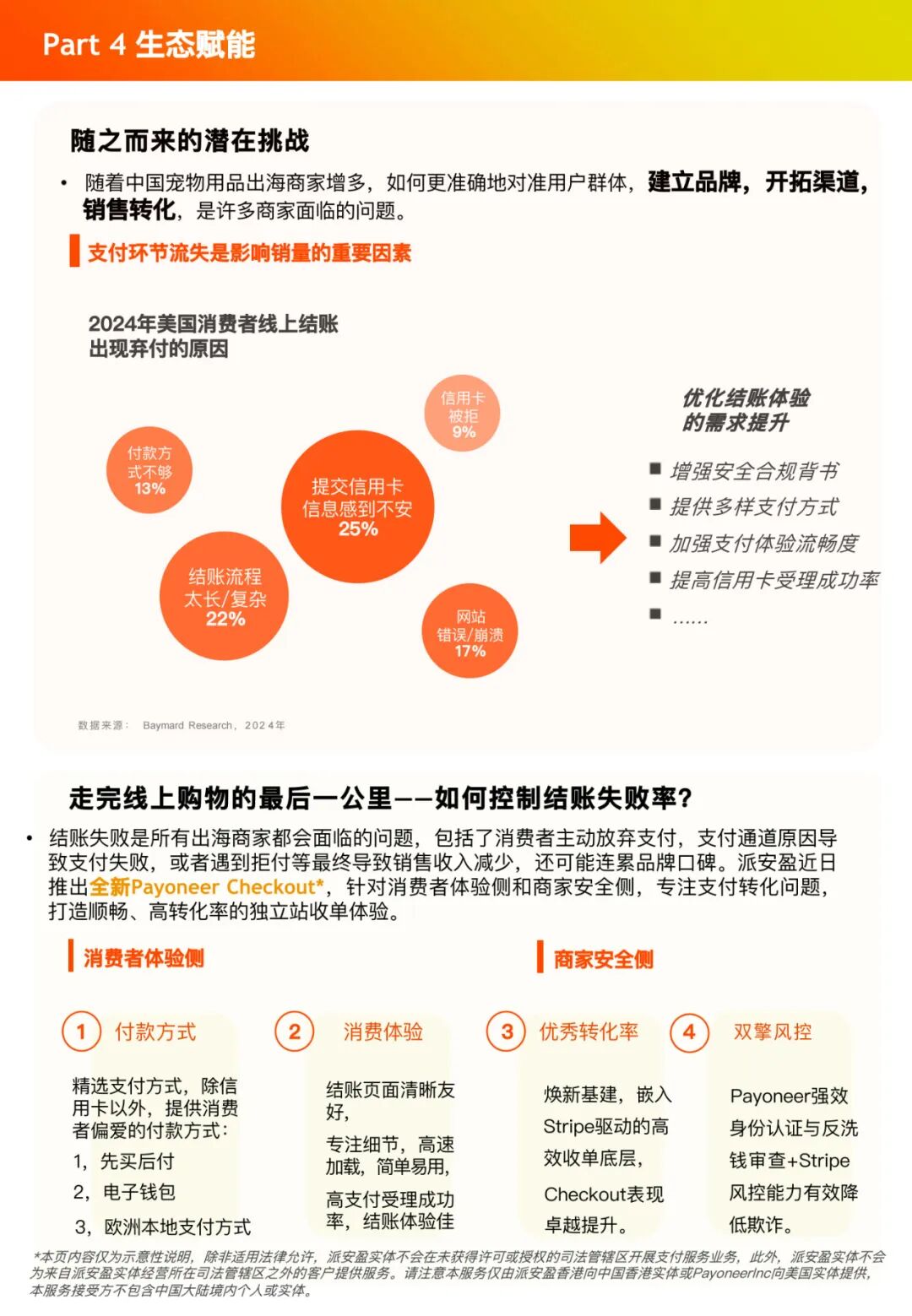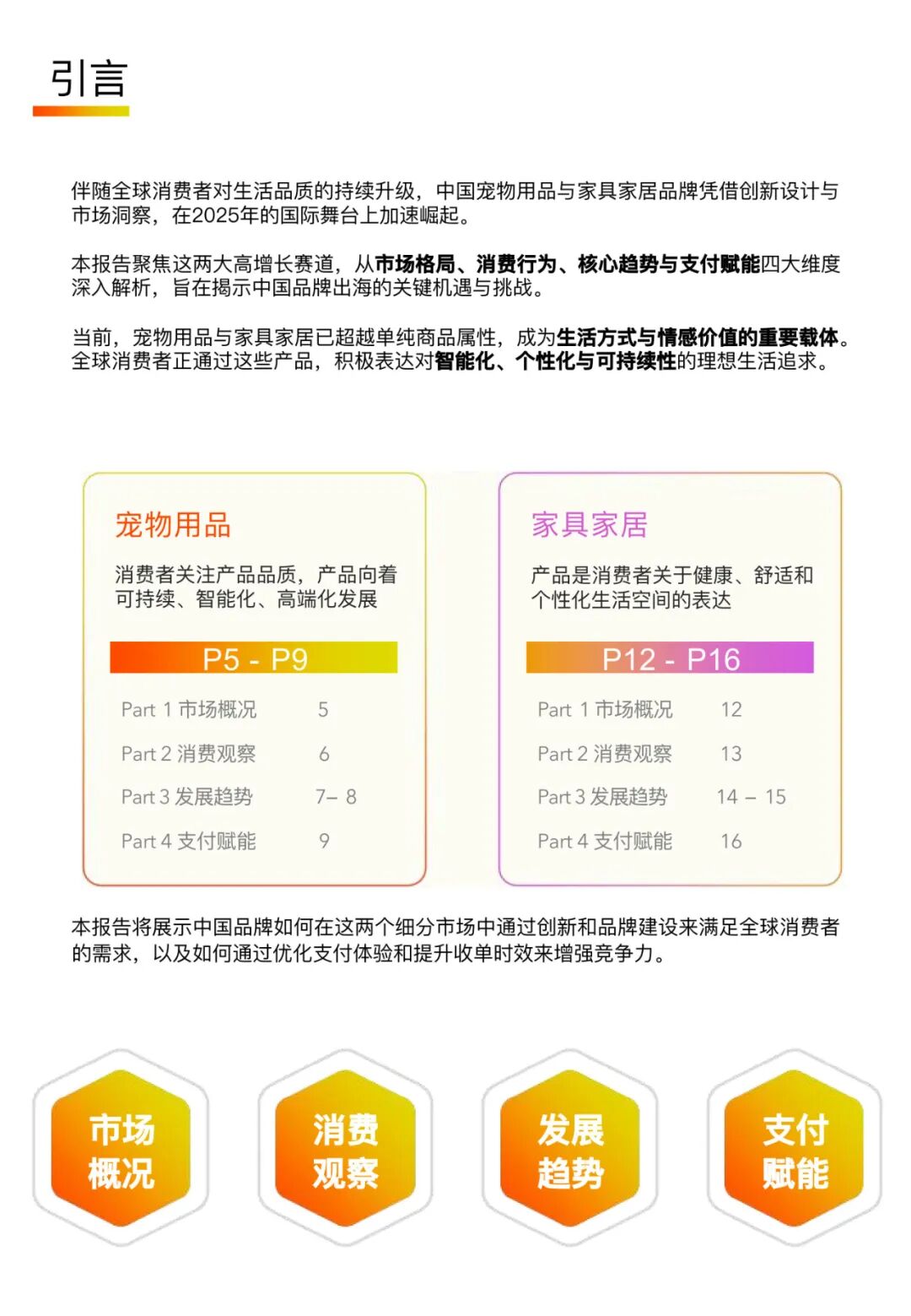 报告指出,全球宠物用品与家具家居市场持续增长。宠物用品方面,市场向智能化、高端化及可持续发展,中国智能宠物用品品牌在海外表现突出,千禧一代是核心消费群体。家具家居方面,消费者更青睐户外家具与简约风格,并高度重视产品的可持续与健康属性,线上搜索是关键决策渠道。报告同时强调,优化独立站支付体验、提供多样支付方式对提升转化率至关重要,并介绍了支付解决方案以应对跨境收款挑战。