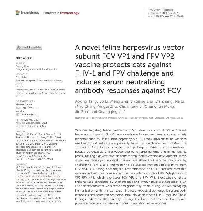 近日,中国农业科学院上海兽医研究所(简称 “上兽研”)伴侣动物生物安全风险预警及防控技术团队,基于猫疱疹病毒弱毒株研发的猫疱疹-猫细小- 猫杯状三联活载体疫苗正式问世。该疫苗创新性采用滴鼻免疫方式,相关研究成果已发表于国际免疫学权威期刊《Frontiers in Immunology》,为全球猫科动物传染病防控提供了全新解决与参考方案。