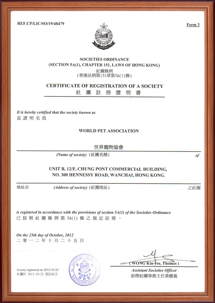 世界宠物协会(WORLD PET ASSOCIATION简称WPA),总部位于中国香港,由世界各地从事宠物行业的个人和单位在自愿基础上发起成立的全球性行业联合组织,是具有独立社会团体法人资格的会员制社会团体。协会是由海牙国际权威认证的全球性宠物行业组织,已在国内相关政府部门完成备案手续,由农业农村部作为业务主管单位,并由公安部颁发境外非政府组织代表机构登记证书。